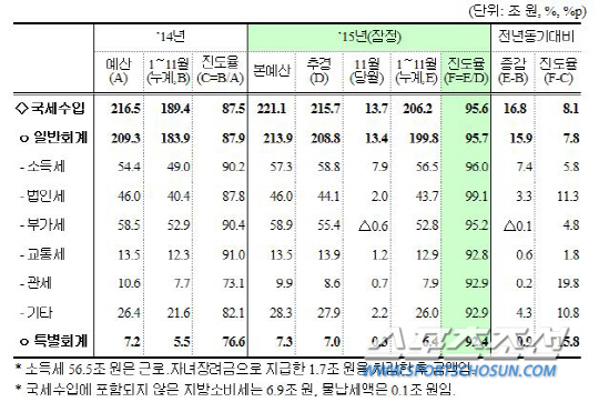 지난해 1∼11월 동안 걷힌 세금이 2014년도 같은 기간보다 17조원 가까이 많은 것으로 나타났다. 이에 따라 지난해 국세수입은 정부 전망치인 215조7000억원을 넘어 4년 만에 '세수결손'에서 벗어났다.