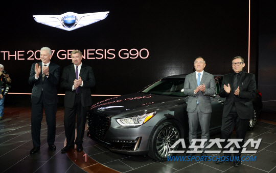 글로벌 브랜드 제네시스의 첫 신차 'G90'는 지난해 12월 국내에 출시해 큰 인기를 얻고 있는 'EQ900' 모델로, 한국 울산 공장에서 생산해 연내 미국 시장에 본격적으로 판매될 예정이다.