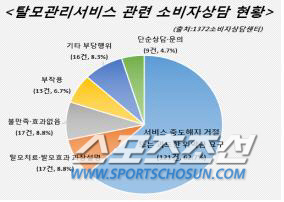 같은 기간 탈모관리서비스 관련 상담 193건 중에서도 '서비스 중도해지 거절 또는 과도한 위약금 요구'가 62.7%(121건)를 차지했다. 다음으로 '탈모치료·발모효과 과장설명'과 '불만족·효과없음'이 각각 8.8%(17건), '부작용'이 6.7%(13건) 등의 순으로 나타났다.