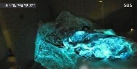 불을 끄면 파란빛을 내는 이른바 '야광 돼지고기'가 중국에서 또 발견됐다.
