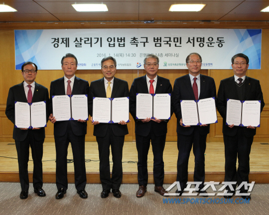 이와 관련, 은행연합회 등 6개 금융협회는 금융권을 대표하여 대한상공회의소 등 경제단체에서 전개하는 '경제살리기 입법 촉구 범국민 서명운동'에도 동참하기로 하고 서명하는 행사를 가졌다.
