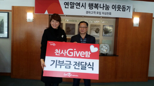 경마고객 모임은 지난해 12월부터 서울역 무료급식소, 안성고아원, 성동구치소 등 소외된 이웃들을 위해 생활필수품, 도서 등을 전달하는 기부행사를 추진해왔다. 경마고객들이 십시일반 모아 '렛츠런파크 천사기브(Give)함'에 넣은 모금액은 이날 참석한 엘림요양원, 과천종합 사회복지관, 강북구립 장애인 보호작업장에 전달됐다.