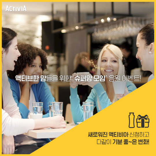 세계 판매 1위 요거트 브랜드 액티비아(Activia)(www.activia.co.kr)가 활기찬 엄마들에게 액티비아를 지원하는 '슈퍼맘 모임' 응원 이벤트를 진행한다.
