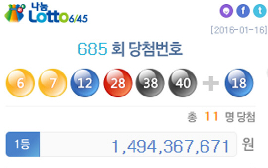 16일 나눔로또는 제685회 로또복권 추첨에서 '6, 7, 12, 28, 38, 40'이 1등 당첨번호로 뽑혔다고 밝혔다. 2등 보너스 번호는 '18'이다.