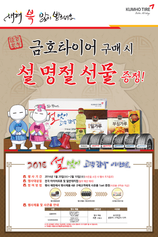 금호타이어가 설 명절을 맞아 오는 2월 10일까지 승용/SUV차량용 프리미엄 타이어 구매 고객을 대상으로 사은품 증정 이벤트를 실시한다.