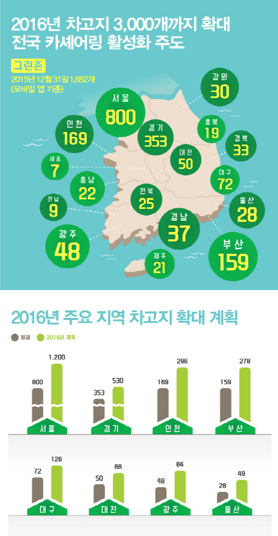 카셰어링 그린카는 올해 전국 3000여개의 차고지(그린존)를 확보, 고객의 서비스 접근성을 높히겠다고 밝혔다.