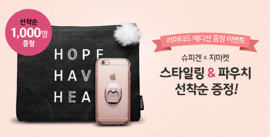 슈파겐코리아는 지마켓 브랜드관 오픈을 기념한 이벤트도 진행한다. 2월 14일(일)까지 선착순 1000명을 대상으로 아이폰6·6플러스·아이폰6S·6S플러스 전용 네오하이브리드EX 및 갤럭시노트5 전용 네오하이브리드CC 구매 시 링타입 핸드폰 거치대 스타일링과 에코 파우치를 함께 증정한다.