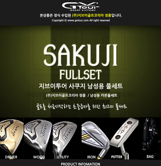 우수한 품질의 골프용품을 부담없는 가격에 제공하는 온라인 쇼핑몰 '리뷰24(www.review24.co.kr)'는 지브이골프코리아 정품 사쿠지 풀세트를 온라인 최저가인 73만9천원에 30세트 한정 판매한다. 남성용과 여성용이 있으며, 1년간 무상 A/S를 받을 수 있는 지브이골프코리아 정품이다.