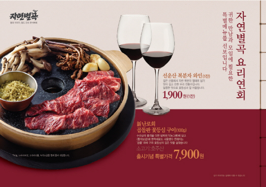 한식뷔페 '자연별곡'(www.naturekitchen.co.kr)이 셰프가 주문 즉시 조리해 제공하는 라이브 메뉴를 강화하고 복분자 와인, 꽃등심 구이 등 추가금액으로 이용 가능한 메뉴를 새롭게 출시하는 등 고객 만족도를 대폭 높이겠다는 방침을 밝혔다.