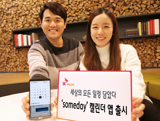 SK텔레콤(대표이사 사장 장동현)이 27일 일정과 관련한 모든 궁금증을 앱에서 검색하고 정보를 확인해 반영할 수 있는 신개념 캘린더 어플리케이션(앱) '썸데이(someday)'를 출시했다고 밝혔다.
