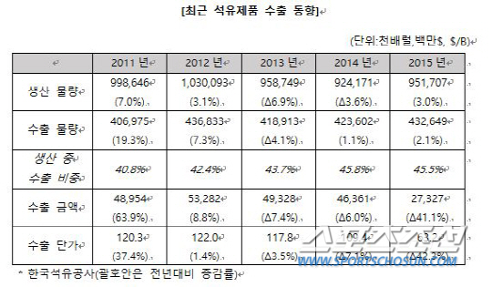 대한석유협회는 27일 SK에너지와 GS칼텍스, 에쓰오일, 현대오일뱅크 등 국내 정유 4사가 2015년 석유제품 생산량 9억5000만배럴 중 45.5%에 달하는 4억3000만배럴을 수출했다고 밝혔다.