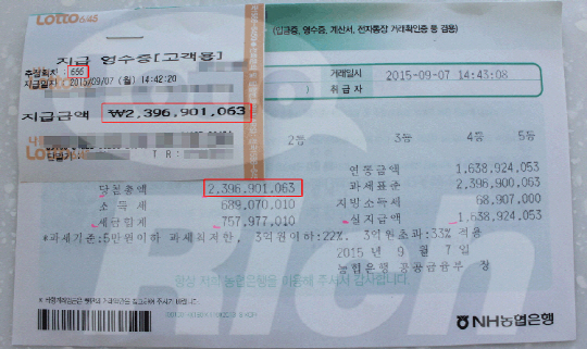 또한 모 로또 포털사이트를 통해 23억원의 로또 1등 당첨금 지급영수증을 공개한 박주호(가명)씨는 "로또 1등 당첨이 너무나 간절해서 한 주도 빠지지 않고 로또를 샀다. 오늘 아침까지만 해도 빚 때문에 근심이 많았는데 불과 반나절 사이 몇 십 억원을 가진 부자가 됐다. 사실 다니던 직장에서 몸을 다쳐 마음고생이 심했는데 좋은 사장님을 만나 재취업도 할 수 있게 됐고, 로또 1등에도 당첨됐으니 오늘이 내 인생 최고의 날인 것 같다"며 기뻐했다.