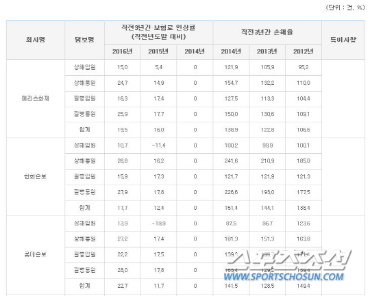 중소형 손보사들도 일제히 보험료를 올렸다. 흥국화재는 무려 44.8%를 인상했다. 이외에 MG손보는 24.0%, 롯데손보는 22.7%, 메리츠화재는 평균 19.5%, 한화손보는 17.7%, 농협손보는 6.8%를 각각 올렸다. 반면, AIG손보는 18.4%를 인하했다.