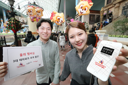 KT(회장 황창규)가 올레 멤버십 고객을 대상으로 전국 3대 테마파크 할인과 스타 셰프 레스토랑 체험 응모 이벤트를 제공한다고 2일 밝혔다. 방학을 맞은 청소년과 대학생이 자주 찾는 전국 3대 테마파크(롯데월드, 캐리비안베이, 서울랜드)의 입장권 및 자유이용권을 파격 할인가에 제공하는 올레 멤버십 '방학을 부탁해!'를 2월 한달 간 진행한다.