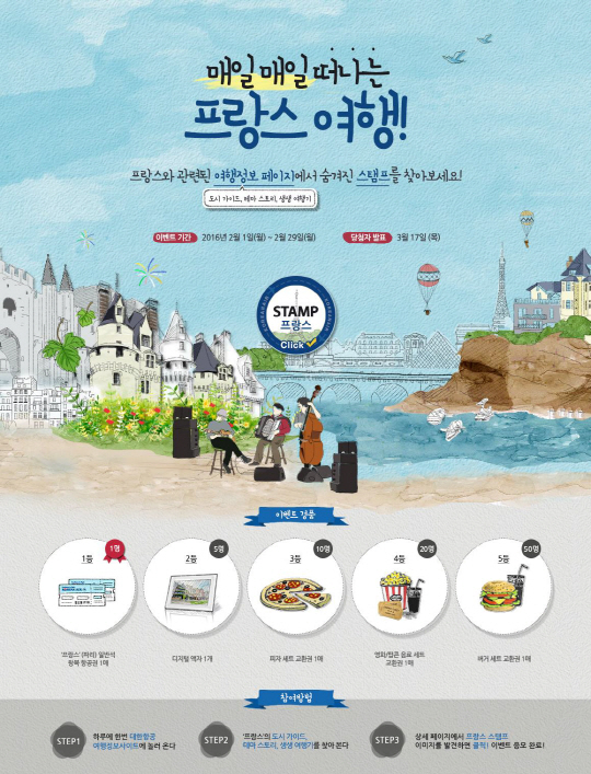 대한항공에 따르면 2월에는 '매일매일 떠나는 프랑스 여행'이벤트를 진행한다. 지난 1월 11일부터 진행하고 있는 '게스트하우스 프랑스'입주자 모집 이벤트와 함께 진행되는 이벤트로 여행정보사이트를 방문해 프랑스의 도시 가이드, 테마 스토리, 생생 여행기 등의 메뉴에 숨겨진 스탬프를 발견하게 되면 응모할 수 있다. 1등 당첨자에게는 프랑스(파리) 일반석 왕복 항공권 1매가 경품으로 제공된다.