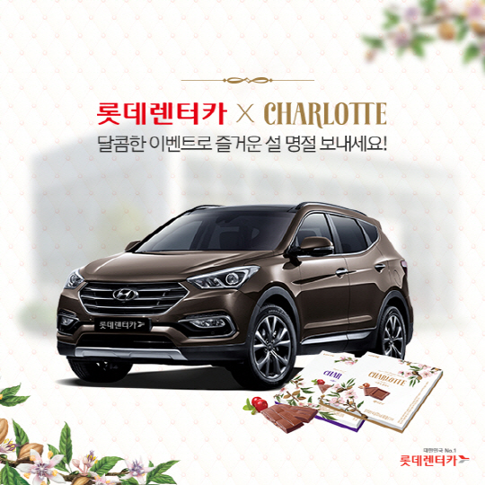 롯데렌터카는 내륙 전 지점 차종별 특별 할인 프로모션을 진행한다. 해당 차종은 레이, SM3, SM5, 말리부, K7 차량이며 명절 연휴기간 동안 70% 할인율이 적용된다. 2월 5일부터 14일까지 전 지점 단기렌터카 대여고객에게는 설날 및 발렌타인데이 선물로 롯데제과 '샤롯데(Charlotte)' 초콜릿을 증정한다. 프리미엄 초콜릿 '샤롯데'는 입안에서 부드럽게 녹는 감촉, 깊고 풍부한 고품질 빈의 향기, 카카오버터 100%, 엄선된 고급 원료 등으로 차별화된 제품이다. 자세한 내용은 롯데렌터카 홈페이지(www.lotterentacar.net) 및 고객센터(1588-1230)를 통해 확인할 수 있다.