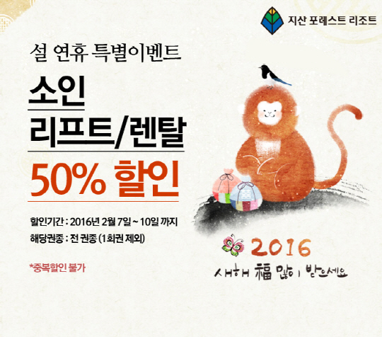 지산 포레스트 리조트(이하 지산리조트)가 설연휴 자녀와 함께 방문 시 다양한 혜택과 즐길거리를 제공한다. 지산리조트는 설 연휴기간인 7일(일)부터 10일(수)까지 '설 연휴 특별이벤트'로 만 12세 이하의 어린이를 대상으로 리프트와 장비렌탈 50% 할인을 실시한다. 리프트의 경우 1회권을 제외한 전 권종에 해당하여 부모들의 부담을 줄였다. 또한 7번 슬로프 쪽에 만 3세에서 6세의 영유아를 대상으로 슬로프에 올라가기 전 스노보드를 놀이처럼 체험해볼 수 있는 '리글렛 파크'를 운영한다. '리글렛 파크'는 유아 전용 헬멧과, 보드, 바인딩, 부츠 렌탈과 함께 전문 강사진이 강습을 진행하며, 파크(언덕)와 기물을 활용해 눈과 친해지고 스노보드를 자연스럽게 즐길 수 있도록 교육하는 것이 특징이다.