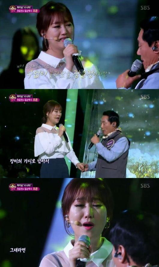 '내 손에 가수' 장윤정이 '칠순택시' 서병순과의 듀엣 무대 중 눈물을 쏟았다.