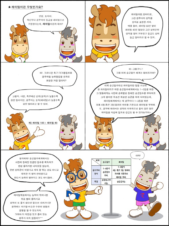 '레이팅 제도'란 경주마의 능력을 숫자로 표현한 것이다. 능력이 뛰어날수록 높은 숫자를 부여받는다. 승급만 허용했던 과거와 달리 실력이 떨어질 경우 강급이 되기도 한다. 때문에 매 경기 비슷한 수준의 경주마 간 경쟁이 가능하여, 훨씬 박진감 있고 흥미로운 경기를 제공할 수 있게 됐다. 실제로 레이팅 제도 실시 이후, 입상마(1위~5위)간 도착차가 단축되었고 코차 승부도 증가한 바 있다. 이럼에도 '레이팅 제도'가 어렵다는 의견이 상당햇다. 마사회는 이에 '레이팅 제도'의 주요 내용을 보다 쉽게 이해시킬 목적으로 홍보만화를 제작-공개하기로 했다. 홍보만화는 '오늘의 경주' 책자, 한국마사회 홈페이지 등을 통해 외부로 공개될 예정이다. 주제는 7개로 '레이팅 제도 설명', '레이팅 부여기준', '부담중량' 등 핵심 사항들이 포함됐다.