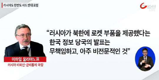 10일(현지시간) 러시아 외무부 미하일 울리야노프 비확산·군비통제 국장은 모스크바 시내 '로시야 시보드냐' 통신사에서 열린 기자회견에서 북한의 핵실험과 장거리 로켓 발사 등과 관련한 질문에 답하면서 "러시아가 북한에 로켓 부품을 제공했다는 한국 정보당국의 발표는 무책임하고 아주 비전문가적인 것"이라고 비판했다.