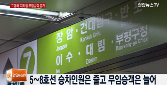 2015년 서울 지하철 5~8호선 이용승객 중 15%가량이 65세 이상 어르신 등 무임승차 승객인 것으로 집계됐다.