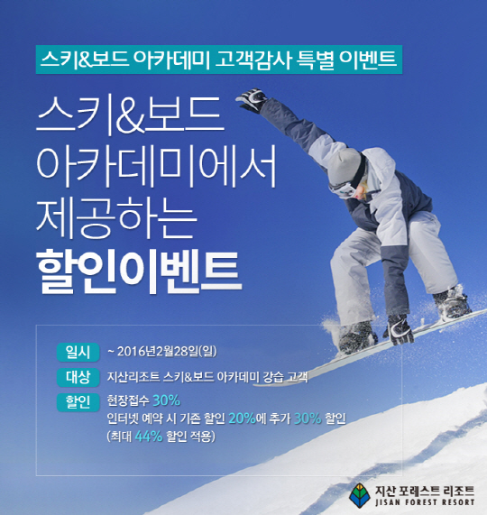 한편 스키시즌이 막바지로 접어들면서 오크밸리에서는 15/16시즌과 16/17시즌을 동시에 즐길 수 있는 1.5시즌권을 출시했다. 전일 시즌권은 어른 21만 원, 어린이 11만 원의 저렴한 가격으로 이용이 가능하다. 아울러 오크밸리 스키장은 모바일 앱 설치 고객들을 대상으로 경품 이벤트를 실시한다. 3월 1일까지 이벤트 기간 중 오크밸리 모바일 앱을 설치한 후 회원가입 인증샷을 올리면 추첨을 통해 10명에게 10만 원 상당의 블루투스 스피커를 제공한다.