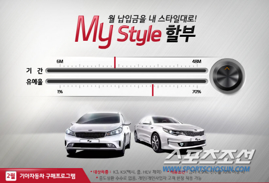 할부기간은 6개월 단위로 조정이 가능하며 유예율은 1%단위로 선택할 수 있다. 조건에 상관없이 연 4.9%의 금리가 일괄 적용되는 것도 장점이다. 예를 들어, 차량가격이 1,374만 원인 K3 가솔린 트렌디 모델을 구매한 고객이 선수율 15%, 할부기간 36개월, 유예율 70%를 선택하는 경우 매달 10만 원 가량을 납부하고 남은 차량대금은 할부기간 종료 후 상환하면 된다. 기존 일반형 할부로 이용할 경우 매달 48만원 가량이 드는 것에 비하면 월 납입금 부담을 크게 줄일 수 있다.