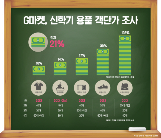 국내 최대 온라인쇼핑사이트 G마켓(www.gmarket.co.kr)이 2월 들어(2월1일~15일) 신학기 대표 품목 5종(아동책가방, 아동신발, 아동의류, 문구, 어린이가구)의 평균 구매금액(객단가)을 조사한 결과 2013년 보다 21% 높아진 것으로 나타났다. 지난해 객단가와 비교해도 6% 오르는 등 매년 증가 추세를 보이고 있다.