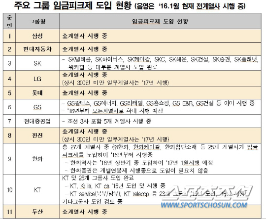 삼성과 현대자동차, SK, 롯데 등 주요 25개 그룹 중 11개 그룹이 1월 현재 모든 계열사에 '임금피크제'를 시행하고 있는 것으로 조사됐다.