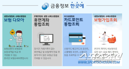 금감원이 한 곳에 모은 서비스는 '금융상품 한눈에', '상속인 금융거래 통합조회', '페이인포', '통합 연금포털', '보험 다모아', '휴먼계좌 통합조회', '카드포인트 통합조회', '보험가입조회' 등 8가지 서비스다.
