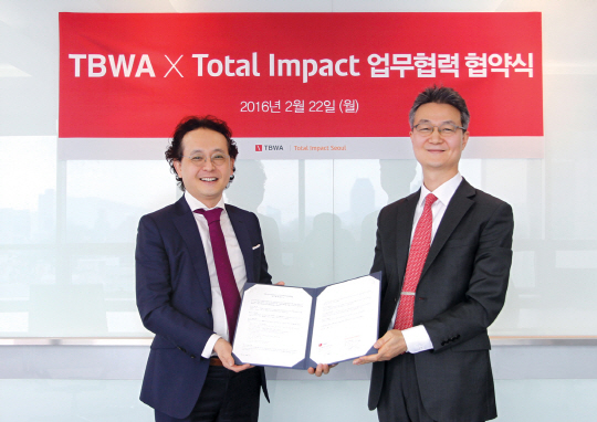 글로벌 독립광고회사인 TBWA코리아(대표이사: 이수원)가 22일 미래 선도적 전문인력 및 기술의 확보를 위해 디자인 전문회사 토탈 임팩트(대표 디자이너: 오영식)와 업무 제휴 협약식을 체결했다.