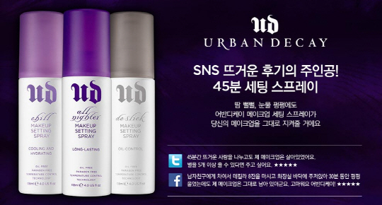 어반디케이 '메이크업 세팅 스프레이'는 획기적인 포뮬라로 유분기로 인해 화장이 번지고 녹아 내리는 스머징(Smudging) 혹은 멜트 다운(Melt down)현상을 막아줘, 마치 방금 메이크업을 한 듯 오래도록 아름답게 유지시켜주는 것이 특징이다. 또한, 모든 피부에 적합한 '올 나이터(All Nighter)', 건성 피부에 최적화된 '칠(Chill)', 지성 피부를 위한 '디슬릭(De-Slick)'까지, 총 3종으로 구성돼 피부 타입에 따라 선택이 가능하도록 했다. 가