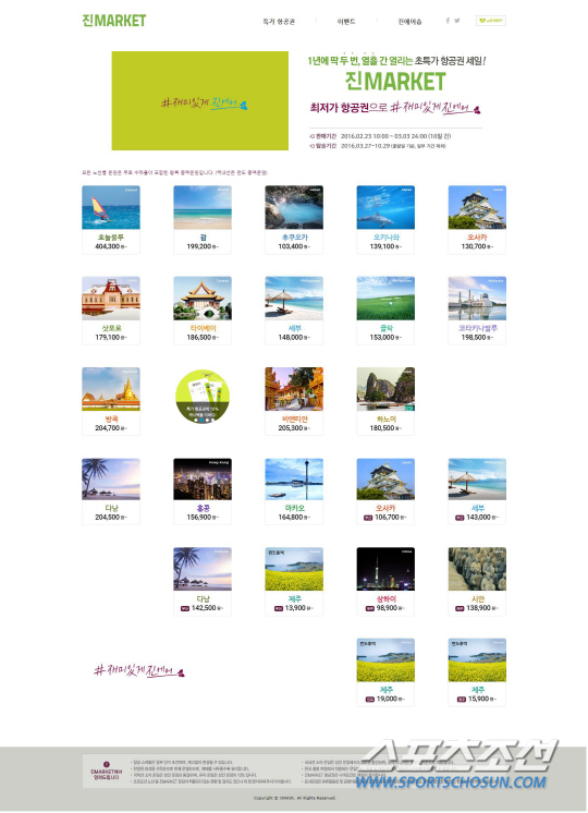 실용항공사 진에어는 23일, 이날 오전 10시부터 오는 3월 3일까지 10일간 연중 최대 특가 프로모션인 '진마켓'을 오픈하고 국내외 24개 노선을 최대 84% 할인 판매한다고 밝혔다.