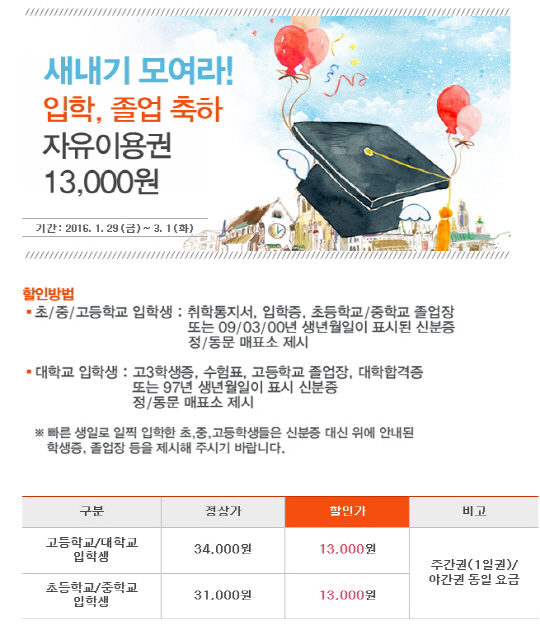 서울랜드는 졸업 및 입학시즌을 맞아 오는 3월 1일까지 졸업생과 입학생을 대상으로 자유이용권 60% 할인 이벤트를 진행한다. 새로운 시작을 응원하기 위해 초 ,중, 고, 대학 입학생들을 대상으로 실시하는 이벤트로 눈썰매장과 난타공연도 무료로 즐길 수 있다.