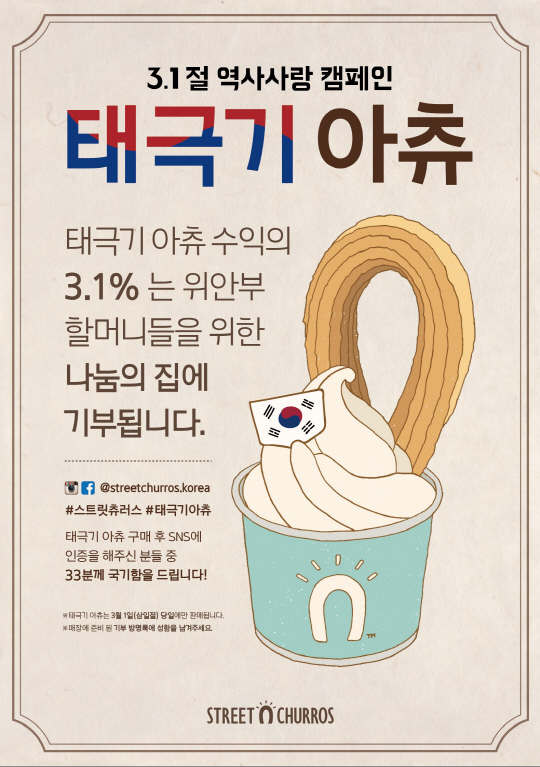 이와 함께 삼일절을 잊은 청춘들을 위한 의미 있는 이벤트도 마련했다. 스트릿츄러스 공식 페이스북(https://www.facebook.com/streetchurroskorea)을 통해 1919년 3월 1일 독립선언서에 서명한 민족대표 33인을 소개하고, '태극기아츄'를 구매한 고객이 SNS를 통해 인증샷을 올리면 추첨을 통해 총 33명에게 국기함을 증정하는 이벤트다.