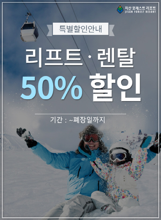 지산 포레스트 리조트(이하 지산리조트)가 가는 겨울을 아쉬워하는 스키 및 보드 마니아들을 위해 고객감사 특별 할인 행사를 진행한다. 3월초 폐장 일까지 지산리조트를 찾는 모든 내방객은 별도의 제휴카드가 없어도 스키와 보드 렌탈 및 리프트를 50% 할인된 금액에 이용할 수 있다.
