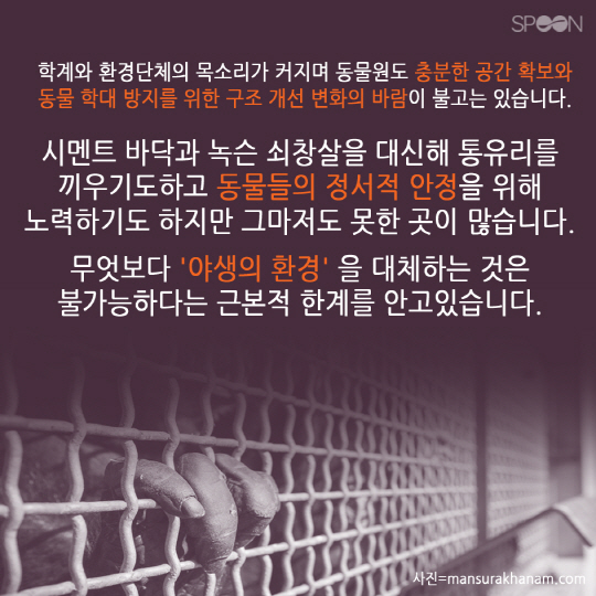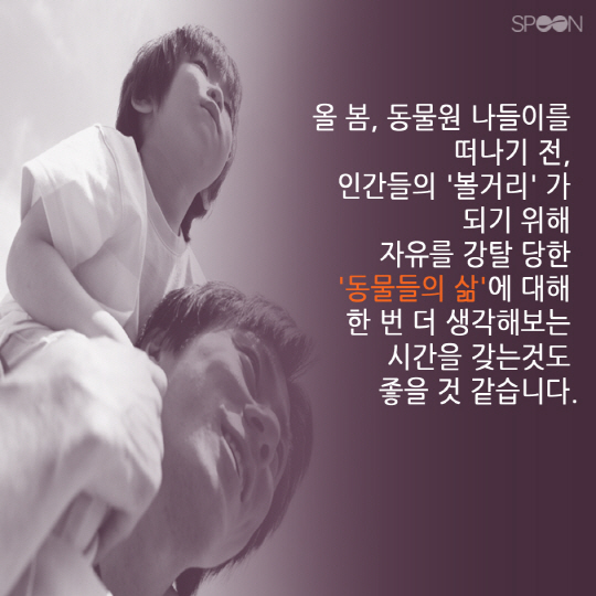 봄의 전령이 기지개를 펴고 포근한 입김으로 동장군을 밀어내면 땅위엔 새싹이 움트고 세상은 연녹색으로 물들게 됩니다. 가족·연인과 한결 가벼워진 옷차림으로 나들이하기에 제격인 계절, 가장 먼저 떠오르는 곳 중 하나가 바로 동물원입니다. 하지만 그곳엔 누구나 한번쯤 생각해 보았을 '불편한 진실'이 숨겨져 있습니다. 동물원 동물들은 왜 항상 우울해 보일까? 그들은 왜 늘 축 쳐져 있는 걸까? 요즘 '동물복지'에 관한 사회적 관심이 커지고 있는 가운데 인간의 욕망으로 탄생한 '동물원'의 문제점과 개선방향에 대해 살펴보았습니다. 김변호기자 bhkim@sportschosun.com