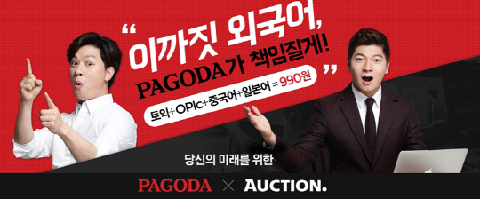 온라인마켓플레이스 옥션(www.auction.co.kr)이 '파고다어학원'과의 온라인 첫 제휴를 기념해 20일까지 외국어 4개 강의 모두를 단돈 990원에 구매할 수 있는 '프리패스 이벤트'를 진행한다.