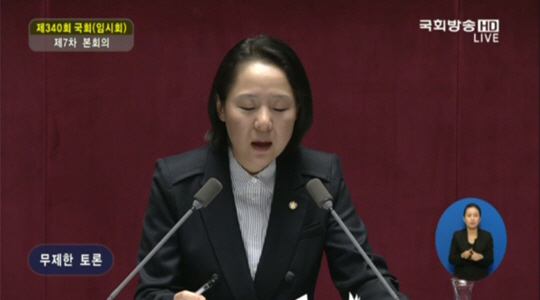 이어 임수경 의원은 "많은 의원들이 장시간 동안 이렇게 필리버스터를 진행하는 것은, 정부 여당이 어떠한 수정안도 받아들이지 않기 때문에 계속되는 것"이라며 "어떻게 정치에 바늘만큼의 틈도 없는가"라고 강조했다.
