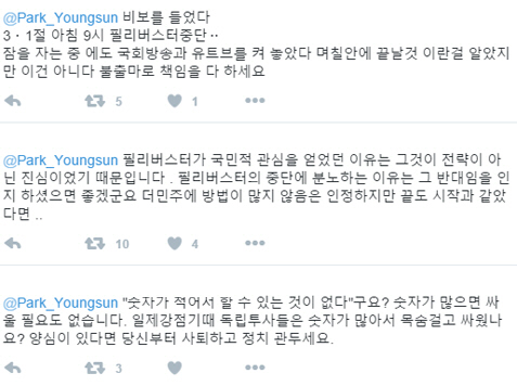 이와중에 박영선 비대위원의 SNS에는 항의성 글이 쏟아지고 있다. "필리버스터 중단하고 과반의석 호소가 말이 되냐", "필리버스터 중단한다는 비보에 가슴이 아프다", "필리버스터는 전략이 아니라 진심이었기에 국민적 관심을 얻었다. 필리버스터의 중단은 진심이 아니라 전략이었다는 뜻", "설령 총선이 연기되더라도 테러방지법을 막아야한다" 등의 글들이 이어지고 있다.