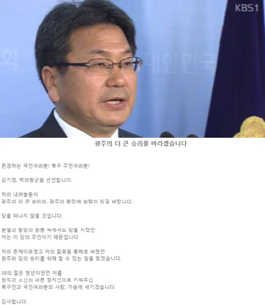 4.13 총선에서 지역구가 전략공천 지역으로 선정돼 사실상 공천에서 배제된 강기정(광주 북갑) 의원이 2일 '백의종군'을 선언했다.