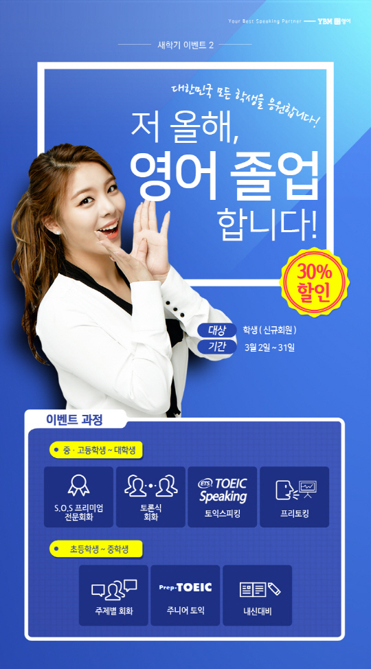 YBM시사(대표 최재호)가 신학기를 맞아 3월 동안 필리핀 전화영어 학생 할인 이벤트를 실시한다.