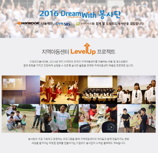 한국타이어가 아동·청소년의 건강한 성장에 기여하고 자원봉사자들의 사회공헌 아이디어를 실현시킬 수 있는 '지역아동센터 레벨업(Level-Up) 프로젝트 2016 드림위드(Dream With)'를 모집한다.