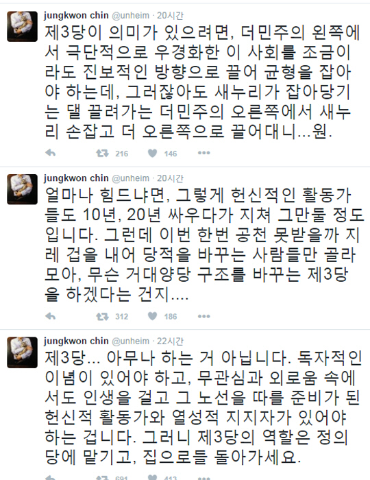 또 "제3당이 의미가 있으려면, 더민주의 왼쪽에서 극단적으로 우경화한 이 사회를 조금이라도 진보적인 방향으로 끌어 균형을 잡아야 한다"라며 "그러잖아도 새누리가 잡아당기는 댈 끌려가는 더민주의 오른쪽에서 새누리 손잡고 더 오른쪽으로 끌어댄다"라고 목소리를 높였다.