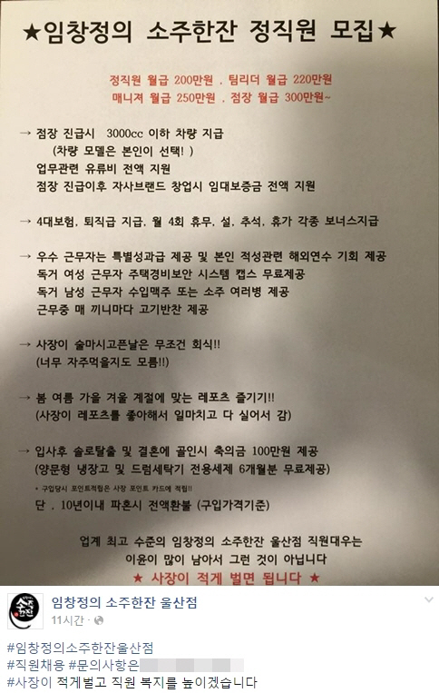 7일 '임창정의소주한잔' 울산점은 공식 페이스북을 통해 정직원 채용공고를 올렸다. 아르바이트생이 아닌 정직원을 모집하는 것도 특이하지만, 채용공고에 적힌 혜택 또한 남다르다.