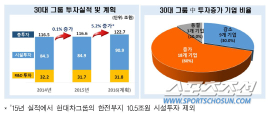 지난해 3월 전경련이 발표한 '2015년 투자계획조사'에서 30대 그룹은 연초 125조9000억원의 투자를 계획했지만, 이번 조사를 통해 실제 집행된 투자액은 116조6000억원인 것으로 확인됐다. 이는 지난해 하반기 중국발 경제쇼크, 세계적인 경기 침체 등 투자전망이 불확실해짐에 따라 주요 기업들의 투자집행률이 낮아진 때문으로 분석된다.