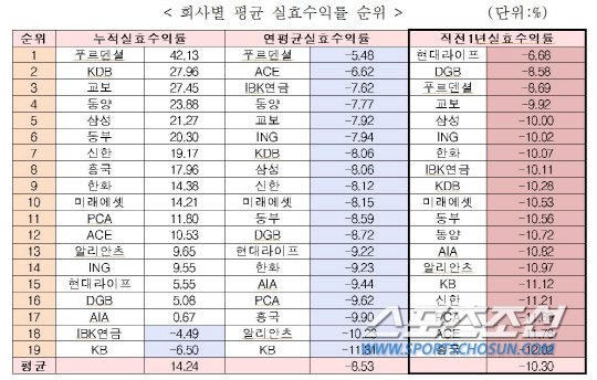 생명보험사들이 공표한 공시수익률을 소비자가 실제로 낸 돈 대비 실효수익률(2015년 12월말 기준, 사업비를 제외한 보험료의 86%~94%만 펀드 투입)을 산출한 결과다.