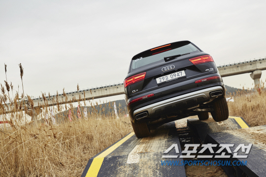 체험에 앞서 뉴 아우디 Q7에 탑재된 적응식 에어 서스펜션을 작동했다. 오프로드 주행시 서스펜션이 60㎜까지 올라가 지상고를 최대 245㎜ 상승시키며 장애물 통과를 용이하게 도와준다.
