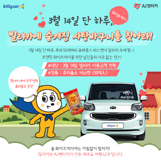 AJ렌터카가 화이트데이(3월 14일)를 맞아 빌리카(Billycar)를 이용하는 고객 대상으로 캔디박스를 증정하는 이벤트를 진행한다고 11일 밝혔다. 깜짝 선물로 마련한 캔디박스는 14일 빌리카를 픽업하는 고객이면 누구나 받을 수 있으며 예약한 차량의 트렁크를 통해 확인 할 수 있다.