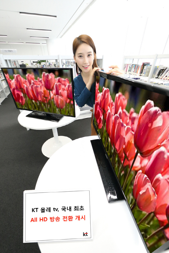 KT가 14일 자사 IPTV 서비스인 KT 올레tv의 실시간 방송 채널을 업계 최초로 All HD화질로 제공할 예정이라고 밝혔다.